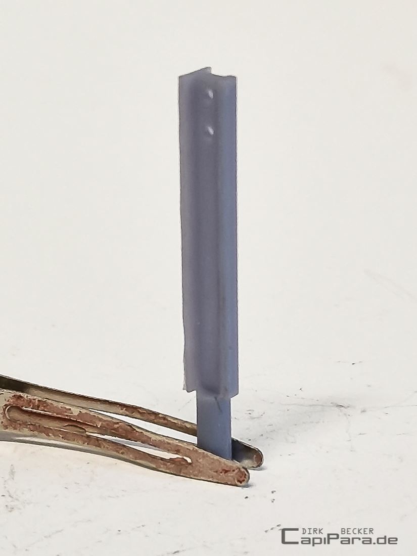 #2406 - Geländer-Pfeiler, Doppel-T-Form, zwei Bohrungen, Länge = 4,0 mm, Breite = 3,8 mm, Höhe = 34,6 mm