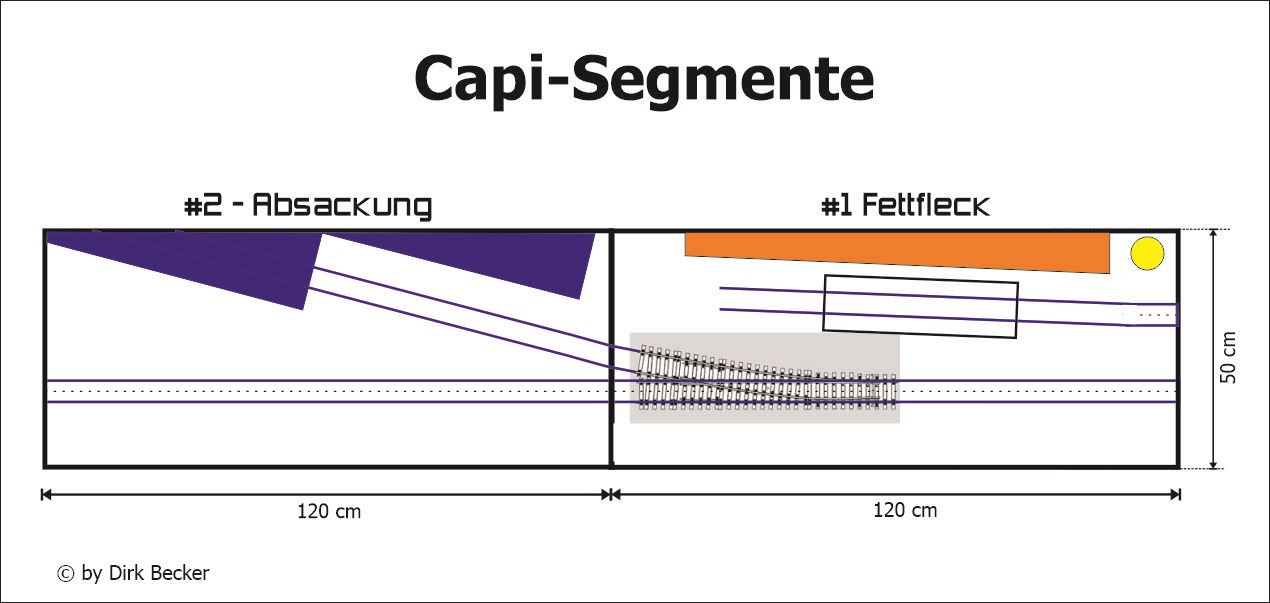 Als Motiv für die ersten beiden Segmente habe ich mir eine Ecke in Mitteldeutschland ausgesucht, konkret einen Anschluss in einem chemischen Großbetrieb. Darum nenne ich diese zwei ersten Segmente auch "Fettfleck" und "Absackung". Auf dem Fettfleck werden Kessel- und Säuretopfwagen beladen und in der Absackung werden Endprodukte, die in Säcke und Fässer verpackt sind, in G-Wagen verladen.